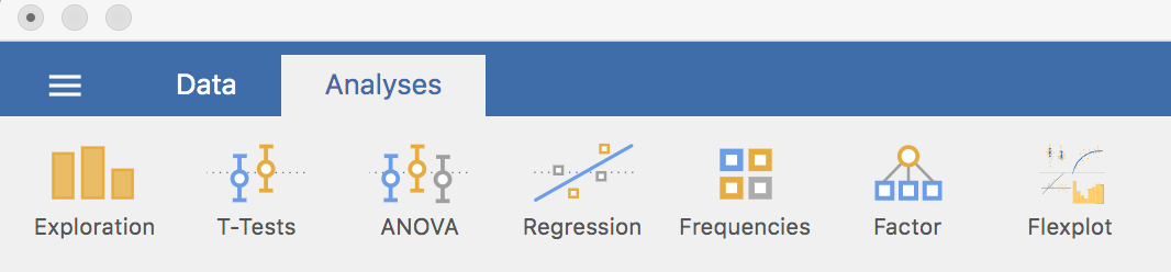 In jamovi, you will be switching between 2 modes: Data and Analysis, corresponding to the 2 tabs in the image above. Data is the spreadsheet where you can see the raw data and do other things that you can do in a spreadsheet. Analysis is where you calculate statistics, make tables and make figures. The other mode, which you access by clicking on the 3 horizontal lines to the left of Data lets you open up new data and close existing data.